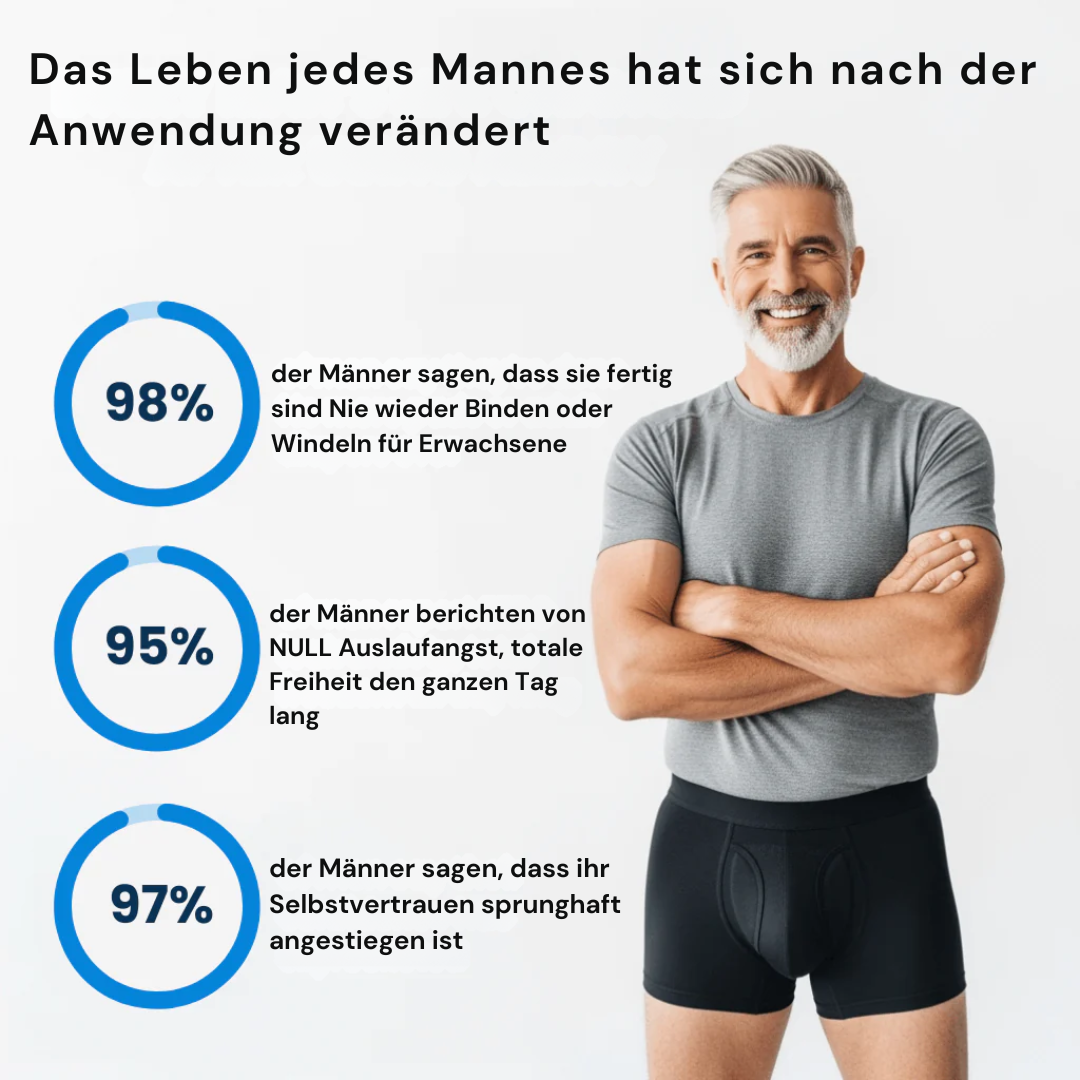 92 % der Männer haben ihr Selbstvertrauen ohne teure Erwachsenenwindeln zurückgewonnen, nur durch die Verwendung unserer Unterwäsche. Jeder Slip ist über 5 Jahre wiederverwendbar.